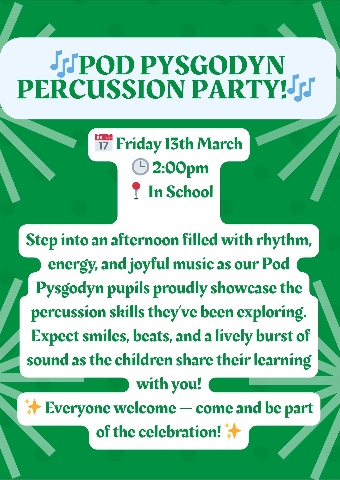 Get ready for an afternoon full of rhythm, music, and smiles — Pod Pysgodyn are hosting their very own Percussion Party on Friday 13th March at 2pm! 🎉