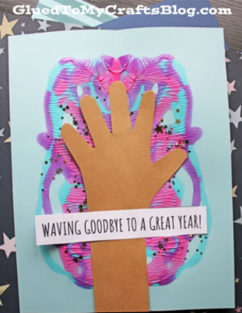 Draw around your hand on an A4 piece of paper, in the middle of the hand write the title 'Waving Goodbye To A Great Year'.