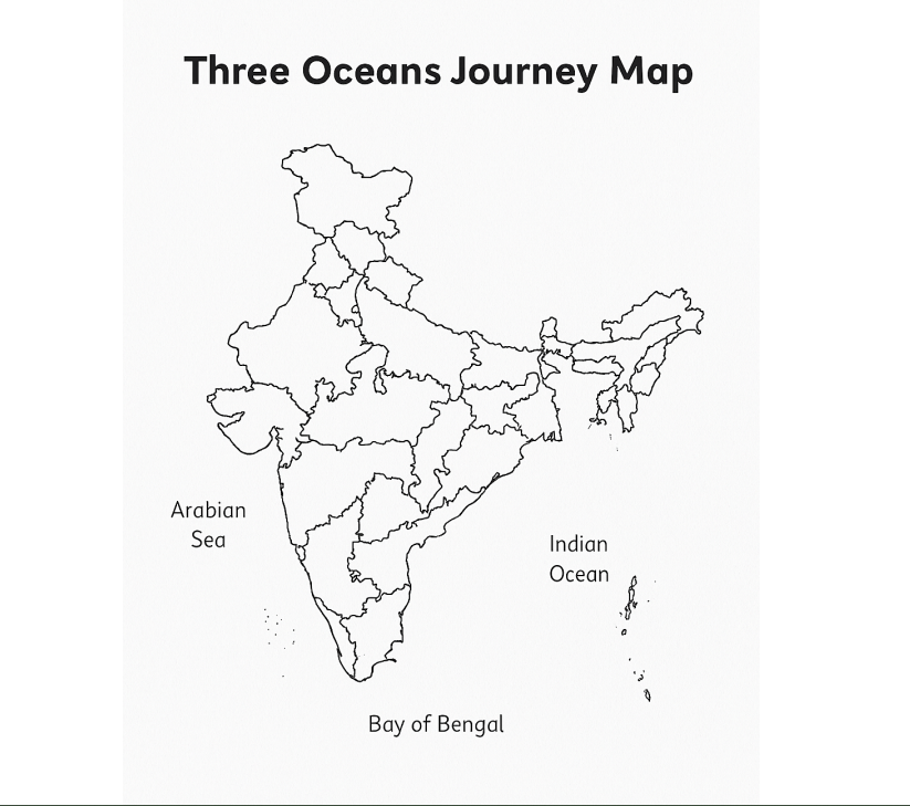 - Label the three bodies of water: Arabian Sea, Bay of Bengal, Indian Ocean.