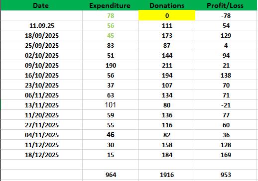 The table shows Expenditure, Donations, and Profit/Loss for different dates.