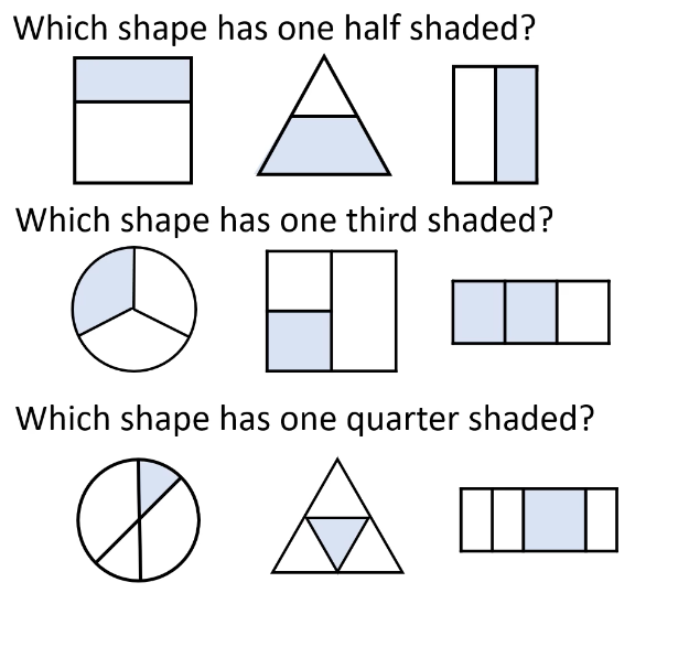 LO to identify 1/3, 1/4, 1/2, 2/4, 3/4 and demonstrate that all parts must be equal parts of the whole.