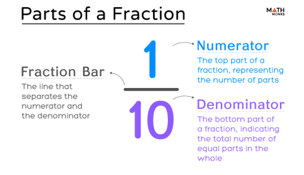 When we write a fraction, we often write three parts. The Numerator, the Fraction bar and the Denominator.