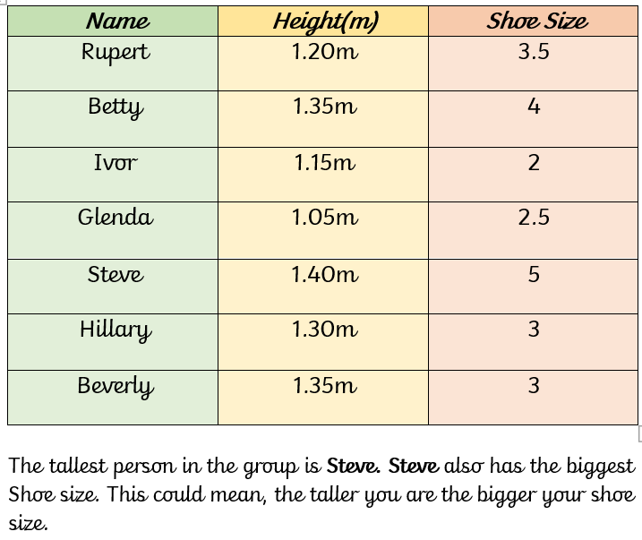 Chilli 2 - Measure and compare the height and shoe size of the Year 2 pupils in Grwp Rotherslade & Horton.