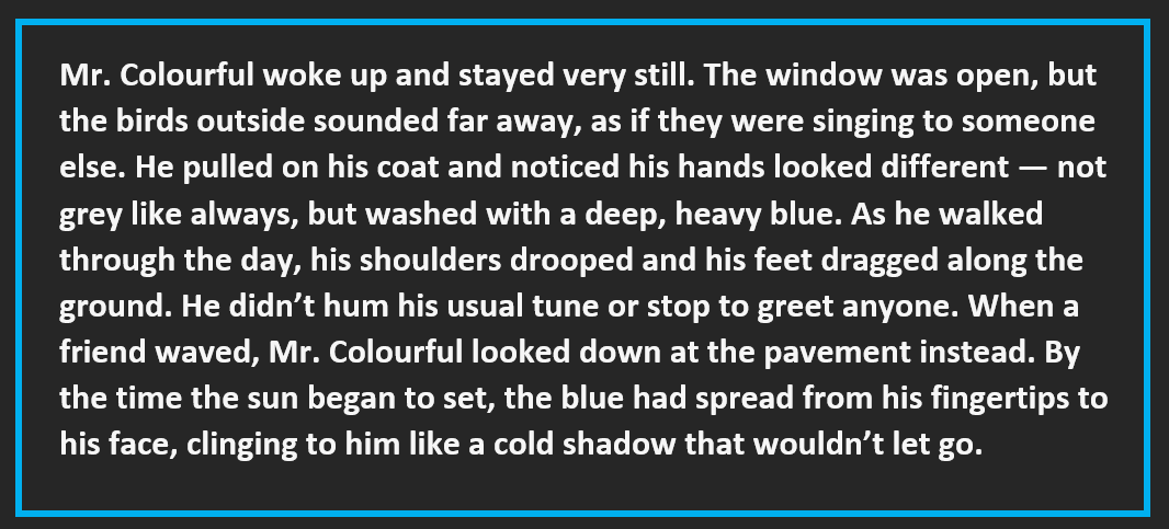 Create a scenario where Mr. Colourful turns blue. Write a short story using the WAGGOLL and placeman about how Mr. Colourful turns blue.