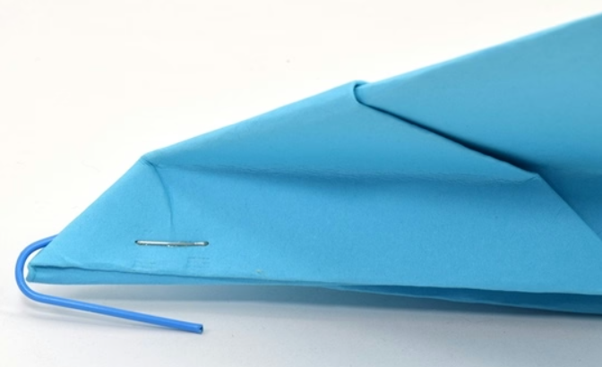 2. Tape or staple a paper clip to the nose of each paper aeroplanes. The outer straight part of the paper clip should point backward parallel to the bottom of the plane, so it can serve as a hook to attach to the rubber band. There will be some pull on the hook, so make sure it's secure.