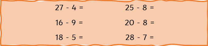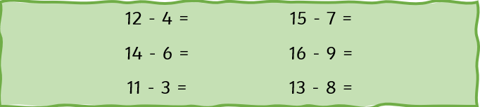 Can you make the calculation using ten frames? Then show the subtraction by crossing off the squares that the calculation is telling you to. Write the calculation and answer next to each ten frame.