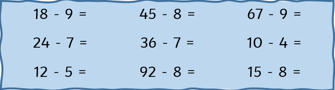 Can you make the calculation using ten frames? Then show the subtraction by crossing off the squares that the calculation is telling you to. Write the calculation and answer next to each ten frame.