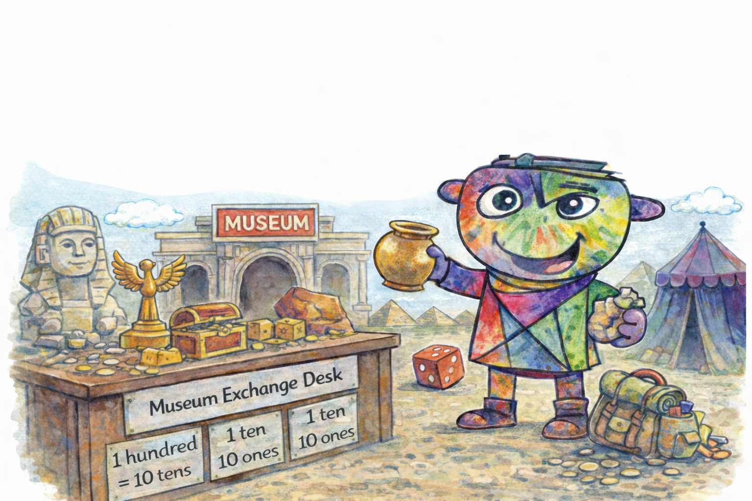 Today, you’re going to help me! You’ll use your base‑10 resources to sort and subtract the artefacts I’ve collected. Start with the number of artefacts in your explorer’s pack, roll the dice to see how many to give away, and record your subtraction in your book. If you don’t have enough ones or tens, visit the Museum Exchange Desk to exchange a big piece for smaller ones — just like exchanging one ten for ten ones.