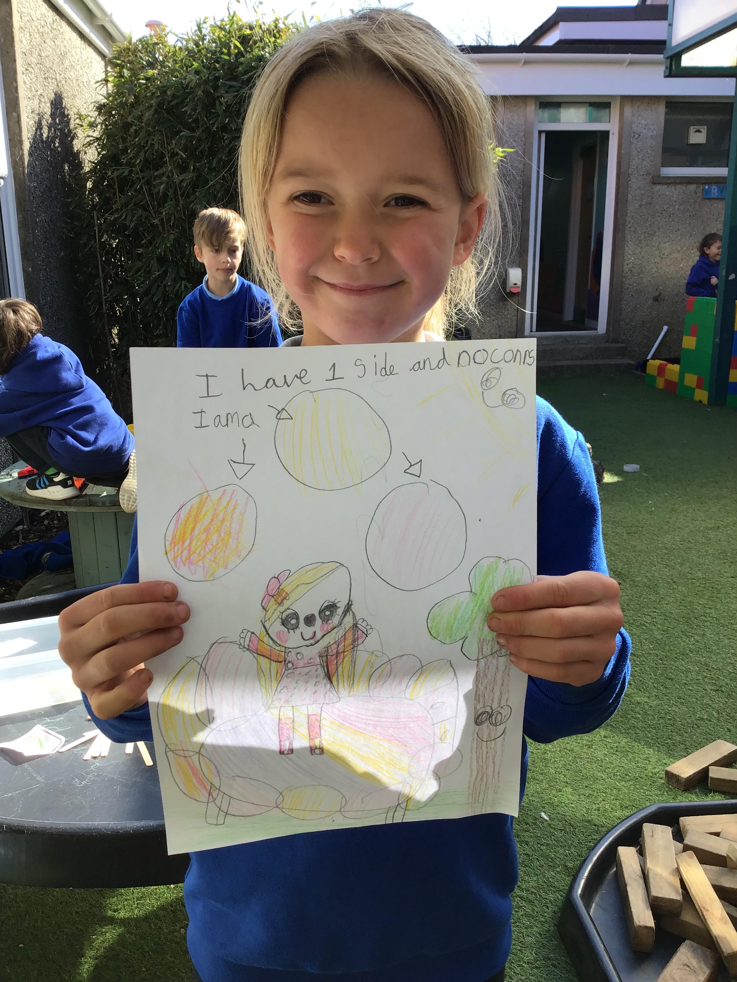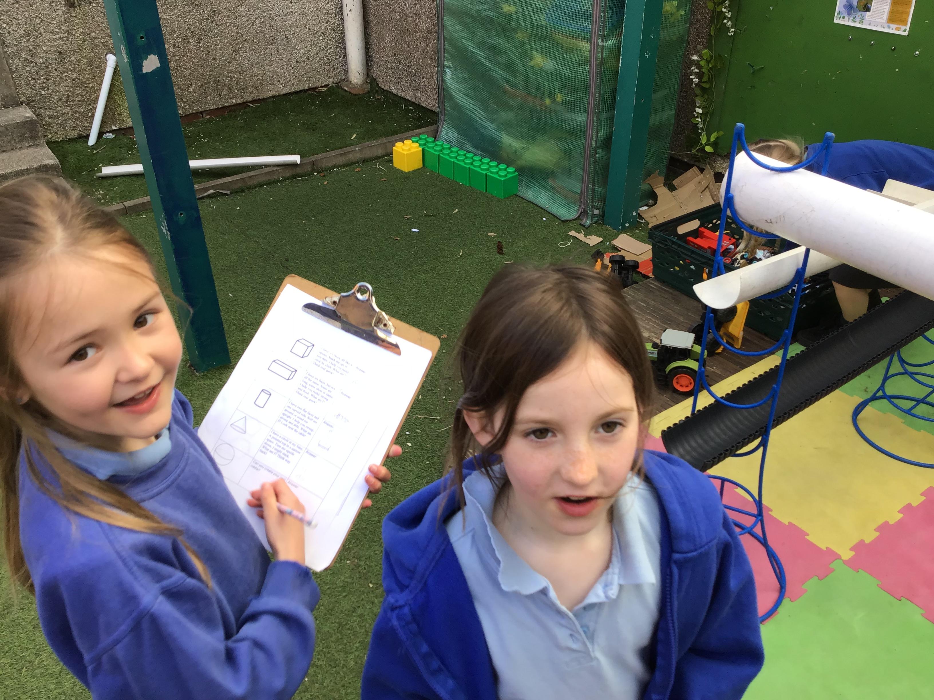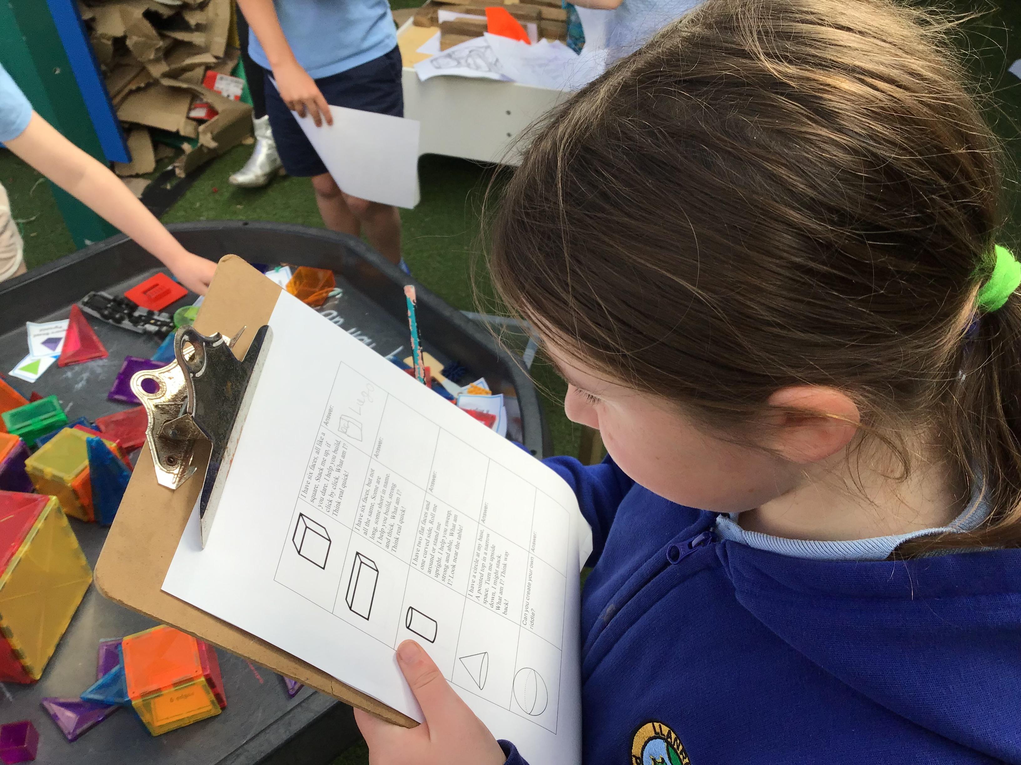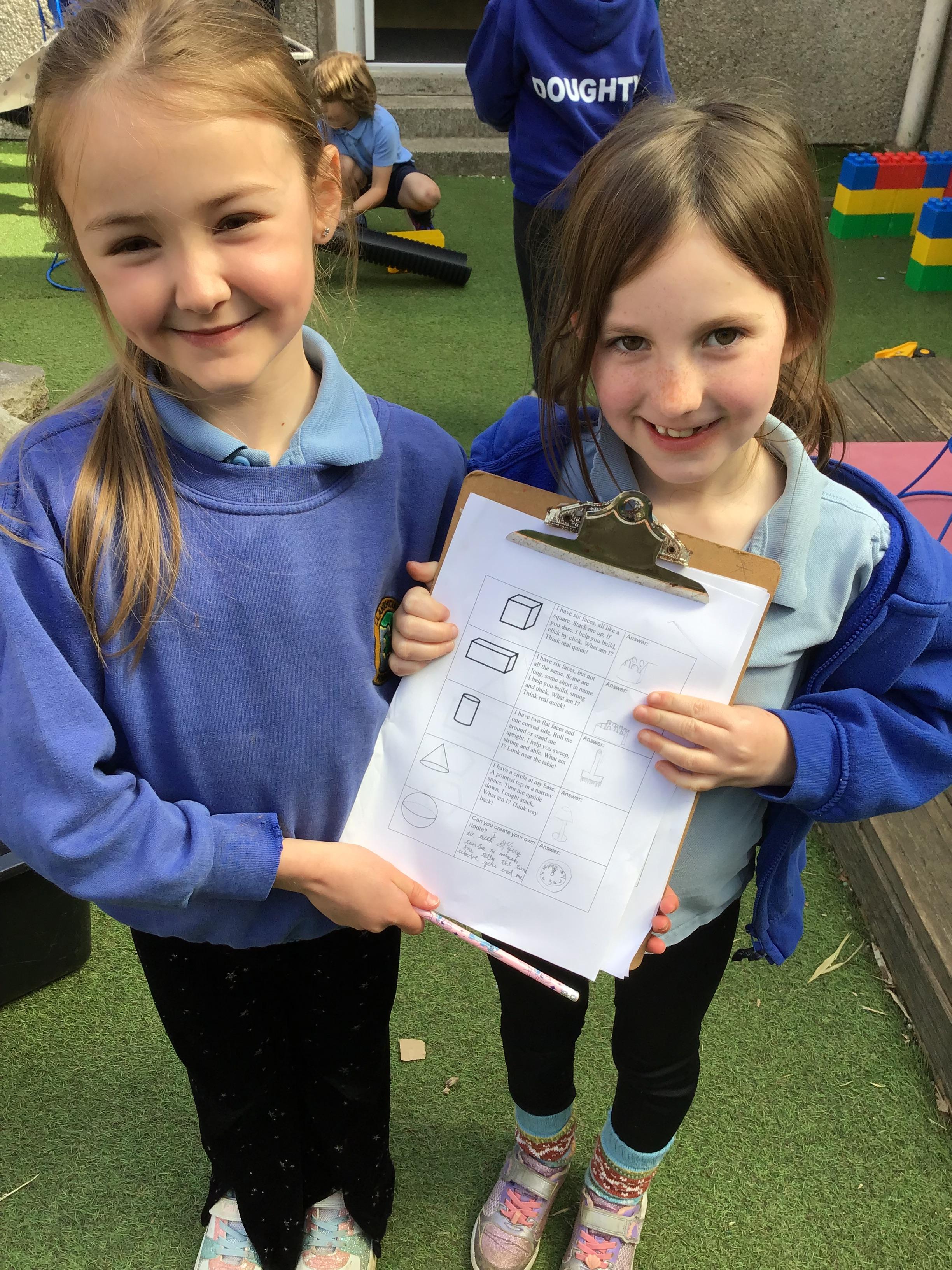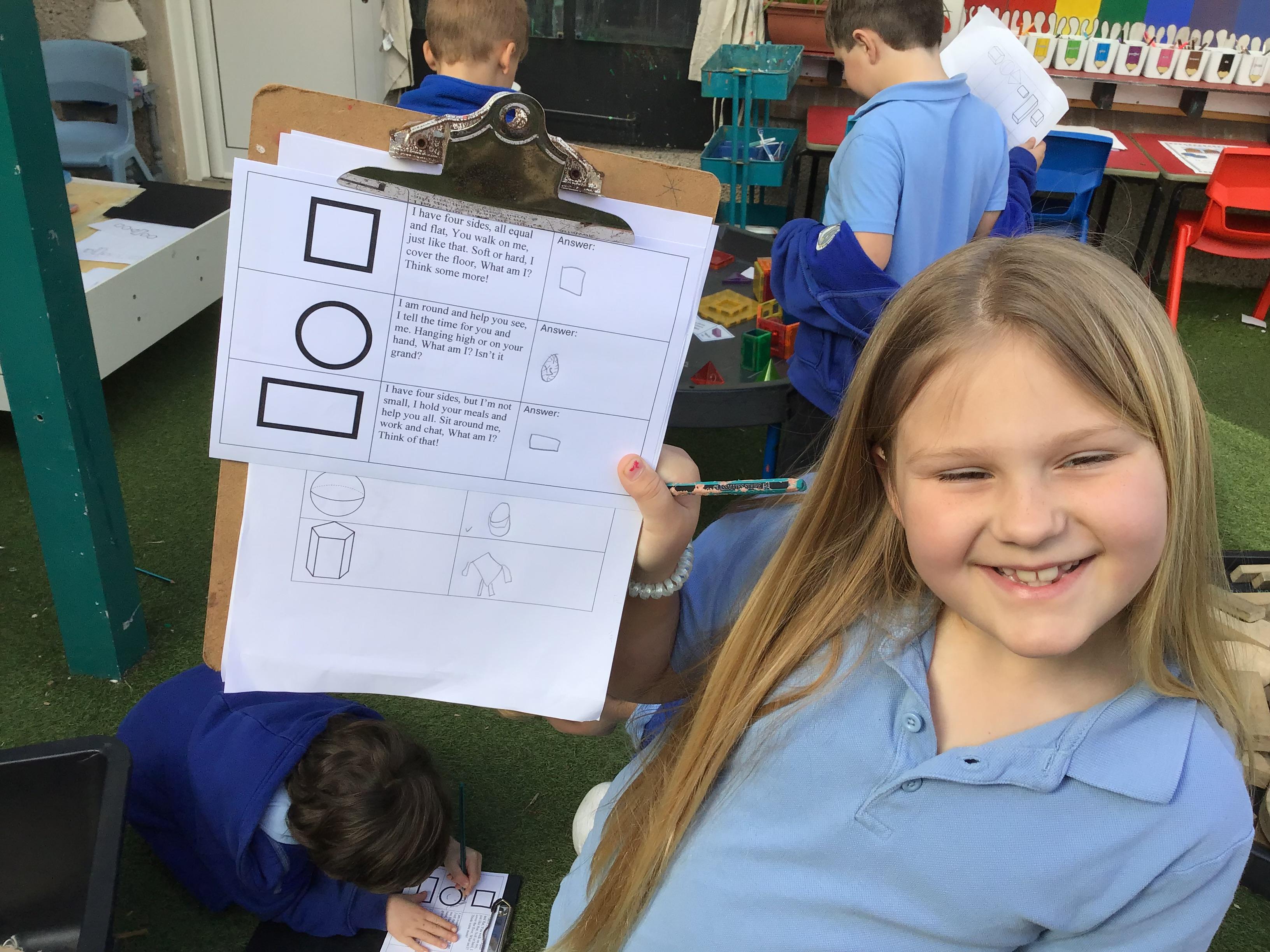 First, they reached a clearing with clipboard on the ground. There was a shape scavenger hunt. However it was no ordinary scavenger hunt. The clues were riddles. The clue read ‘I have one side and no corners, what am I?’. Summer shouted excitedly “It’s me, I am a circle!”. The others cheered good job Summer. They worked their way through the clues: